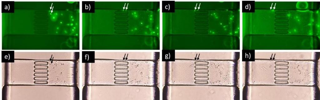Abstract: Tehnologiile emergente de procesare a biomaterialelor la scară micro- și nanometrică oferă în prezent o multitudine de posibilități de manufacturare cu înaltă rezoluție spațială a unor dispozitive microfluidice ce permit testarea reacțiilor biochimice în volume de ordinul nanolitrilor. În acest studiu, prezentăm rezultatele noastre de migrare a celulelor canceroase prin canale micrometrice tridimensionale de sticlă obținute prin procesarea laser cu pulsuri picosecunde (ps) cu rată mare de repetiție asistată de corodare chimică (eng. picosecond laser-assisted etching – PLAE). Am observat că celulele pot migra rapid (aproximativ o oră), iar viteza de migrare este invers proporțională cu volumul canalului. Aplicația prevăzută poate ținti terapia personalizată a cancerului cu un instrument nou de precizie medicală. Mai exact, biopsiile ar putea fi analizate prin cultivarea tumorilor canceroase recoltate de la pacienți în biochip-uri microfluidice. Evaluarea comportamentului populației celulare ar putea fi corelată cu gradul de migrare și invazivitate de la nivel unicelular. Obiectivul este acela de a testa doze individuale pentru radioterapie, chimioterapie specifică, imunoterapie sau combinațiile acestora.