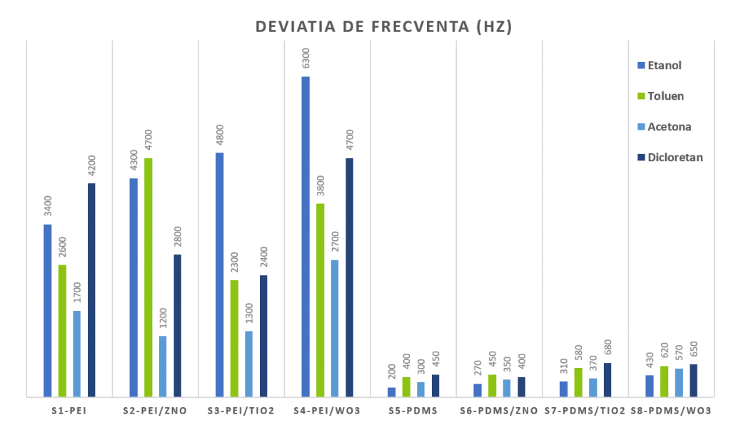 Senzorii obţinuţi au fost testaţi la patru tipuri de VOC (Volatile Organic Compounds-Compuşi organici volatili): etanol, toluen, acetonă şi dicloretan. Prezenţa NP conduce la o creştere considerabilă a sensibilităţii filmelor pentru toate tipurile de NP. Senzorii cu WO3 s-au remarcat ca având cea mai bună sensibilitate pentru majoritatea analiţilor; în mod special aceştia au indicat un salt de frecvenţă mai pronunţat pentru acetonă. De asemenea, s-a putut constata că pentru senzorii cu PEI s-au obţinut salturi de frecvenţă de aproximativ 10 ori mai mari decat în cazul senzorilor cu PDMS.
