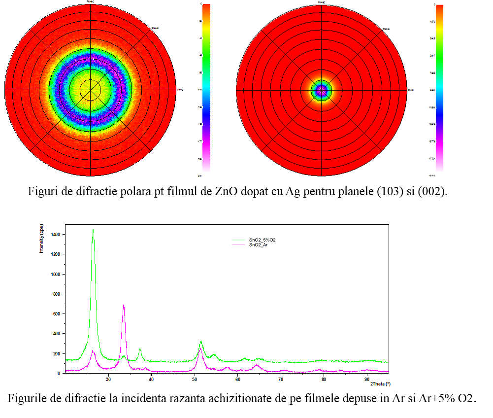 Abstract: În această fază s-au studiat structura şi proprietăţile filmelor de ZnO dopate cu Ag şi ale filmelor de SnO2. Rezultatele investigaţiilor au arătat că pentru filmele de ZnO, o concentraţie de până la 2% Ag nu induce modificări esenţiale în structura cristalină, filmele crescând texturate după direcţia (002), aşa cum au indicat investigaţiile de difracţie cu raze X şi măsurările polare de difracţie de raze X. De asemenea, investigaţiile de reflectivitate speculară şi difuză a radiaţiei X la incidenţă simetrică sau variabilă (XRR şi XRDS) au confirmat că nici densitatea de masă şi rugozitatea suprafeţei filmelor depuse nu este modificată de doparea cu atomi de Ag. Filmele de SnO2 depuse pentru durate diferite folosind Ar sau Ar conţinând 5% O2 au fost investigate folosind tehnici avansate cu rezoluţie nanometrică. Rezultatele au indicat că atât grosimea filmelor, cât şi atmosfera utilizată în timpul depunerii şi temperatura substratului pot afecta structura şi proprietăţile optice ale acestor filme. În funcţie de aplicaţia vizată se pot obţine filme nanocristaline, cu grăunţi cristalini de dimensiuni de ordinul a 10-20 nm, cu valori mici ale micro-stersului şi cu valori ale benzii interzise variabile, în jurul valorii de 4 eV. Deşi investigaţiile de difracţie a radiaţiei X la incidenţă razantă au sugerat şi prezenţa unor compuşi cristalini de tipul Sn3O4 monoclinic pe lângă compusul SnO2 tetragonal, investigaţiile de spectroscopie a electronilor excitaţi cu radiaţie X au indicat prezenţa unui singur compus chimic. Valoarea energiilor de legătură determinate pentru liniile O 1s şi Sn 2p au indicat doar prezenţa compusului SnO2 în filmele depuse. De asemenea, folosirea unei atmosfere conţinând oxigen a rezultat în încorporarea unei cantităţi mici de oxigen în structura cristalină a filmului, fără a afecta parametrii de reţea.