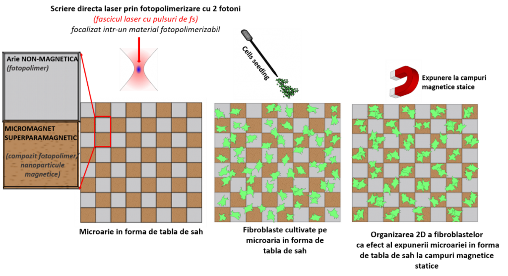 Abstract: Imprimarea în 4 dimensiuni (imprimarea 4D) utilizează aceleași tehnici de imprimare 3D prin depunerea programată de computer a materialului în straturi succesive pentru a crea un obiect tridimensional, la care se adaugă dimensiunea transformării în timp. Imprimarea 4D este un tip de materie programabilă, în care, după procesul de fabricație, produsul tipărit reacționează la anumiți parametri din mediu (în cazul de față la câmpuri magnetice statice) și își schimbă funcționalitatea sau forma în consecință. Studiul demonstrează un concept pentru organizarea celulelor 2D prin expunere la câmpuri magnetice statice folosind micromagneți superparamagnetici fabricați prin scriere directă cu laser prin polimerizare cu doi fotoni (LDW prin TPP) a unui compozit superparamagnetic fotopolimerizabil. Compozitul a constat dintr-un fotopolimer biocompatibil (Ormocore), amestecat cu 4 mg / mL nanoparticule superparamagnetice (MNPs). Micromagneții au fost proiectați în formă de pătrate cu dimensiunea laterală de 70 µm. Pentru a minimiza rolul topografiei asupra ataşării celulelor, am fabricat microarii 2D similare cu o tablă de șah, în care micromagneții superparamagnetici alternează cu zone nemagnetice de formă identică și dimensiune laterală la fel cu cea a micromagneților, realizate din Ormocore prin tehnica LDW prin TPP. Diferența de înălțime între zonele superparamagnetice și nemagnetice a fost de aproximativ 6 µm. S-a constatat că, în absența unui câmp magnetic static, fibroblastele s-au atașezat uniform pe întreaga microarie 2D, fără preferință pentru zonele superparamagnetice sau nemagnetice. Sub acțiunea unui câmp magnetic static de 1.3T, fibroblastele s-au atașat exclusiv pe micromagneții superparamagnetici, rezultând o organizare precisă a celulelor in 2D pe microaria de tip tablă de șah. Metoda descrisă are un potențial semnificativ pentru fabricarea de micromagneți biocompatibili cu geometrii bine definite pentru construirea unor grefe de piele adaptate pentru integrarea optimă a țesuturilor, începând de la manipularea unei singure celule până la formarea de țesuturi şi chiar organe.