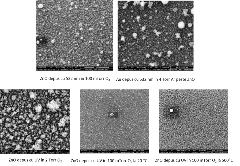 Imagini SEM au scos în evidenţă dependenţa morfologiei straturilor de ZnO depuse prin PLD de presiunea de depunere și lungimea de undă a radiaţiei laser. Depunerea pe substraturi încălzite la temperaturi până la 500 °C, care asigură integralitatea traductorilor interdigitali din componenţa senzorilor SUAS, modifică de asemenea morfologia straturilor de ZnO. Straturile de ZnO cu proprietăţile cele mai promiţătoare din punctul de vedere al senzorilor SUAS pentru detecţia gazelor (H2) sunt cele mai poroase, obţinute în condiţii de presiune foarte ridicată (2 Torr O2) cu radiaţie UV (355 nm). De asemenea, straturile de ZnO obţinute cu radiaţie UV la 100 mTorr O2, la temperatura camerei și la 500 °C au structuri de interes pentru senzori, anume nanofire, respectiv reţea poroasă de nanofire interconectate așezate dezordonat. Straturile de Au depuse în condiţii diferite (presiune, număr de pulsuri) pe ZnO reproduc, în condiţiile studiate, morfologia stratului de ZnO. Structura multistrat Au/ZnO poros va conduce la îmbunătăţirea proprietăţilor senzorilor SUAS în care sunt încorporate prin mărirea efectului masic al răspunsului senzorului (prin porozitatea stratului de ZnO) și prin mărirea efectului acustoelectric (prin structura metal/oxid).