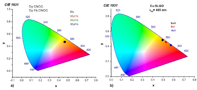 Au fost identificaţi trei centri luminescenţi în Er:CaSc2O4, doi dintre ei corespunzând unor ioni Er3+ ce ocupă poziţii de Ca2+, iar cel de-al treilea ionilor de Er3+ din poziţii de Sc3+.