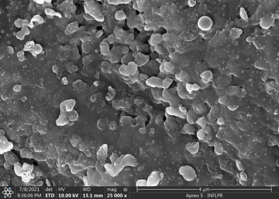 La concentrații crescute de NP, hidrogelurile au structură de rețea compactă în care NP sunt distribuite în mod regulat, au formă sferică și dimensiuni relativ egale. Se poate spune că prin utilizarea unor NP cu dimensiune adecvată, se asigură o distribuție uniformă a NP în hidrogel, care se atașează direct de lanțul polimeric în procesul de amestecare și devin stabilizate în rețeaua hidrogelului ca urmare a reacției de reticulare cu EB.