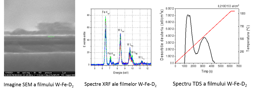 Filmele de W-Cr şi W-Fe obţinute prin depunerea prin metodele DCMS HiPIMS în atmosferă de argon-deuteriu au fost supuse ulterior analizelor morfologice prin investigaţii SEM şi compozitionale prin analiza cu ajutorul tehnicii de fluorescenţă de raze X (XRF). Acest studiu fiind în principal axat pe investigarea comportamentului de eliberare a deuteriului din structurile obţinute, au fost efectuate măsurări TDS pentru determinarea inventarului de deuteriu din probe. Structurile W-Cr şi W-Fe co-depuse în atmosferă de Ar + D2 au prezentat o uniformitate mare a filmului rezultat, iar pentru filmele subţiri obţinute în regim DCMS au fost evidenţiate structuri de suprafaţă, sub formă de semisfere. Desorbţia deuteriului din structurile analizate prezintă caracteristici similare eliberării combustiblului nuclear de fuziune din metale pe intervale largi de temperatură. Desorbţia deuteriului la temperatură scăzută este atribuită eliberării din capcane de energie joasă.