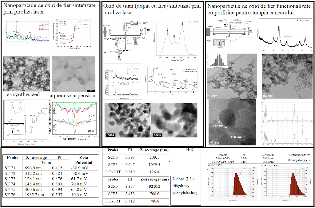 Sunt descrise obținerea de NPs de TiO2 și TiO2 dopat cu Fe prin metoda pirolizei laser. Înainte de obținerea nanopulberii de TiO2 dopat cu Fe (12,28 at %), au fost identificate condițiile experimentale optime pentru obținerea TiO2 în fază majoritară anatas sau rutil ca probe de referință. Astfel caracterizarea probei referință pentru doparea cu Fe indică prezența majoritară a fazei anatas (~81%) și dimensiunea medie a cristalitelor cuprinsă în intervalul (7,4-14,3) nm. NPs sunt analizate comprehensiv: XRD, TEM, SAED, EDS, XPS, Raman, Mossbauer, curbe de magnetizare.