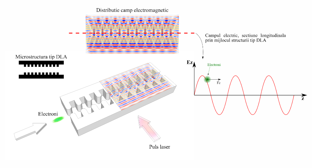 Abstract: Structurile tip DLA reprezintă microstructuri periodice ce pot fi utilizate pentru accelerarea de electroni utilizând radiație laser. Mecanismul de accelerare este asemănător instalațiilor de accelerare liniară prin radio-frecvențe, cu undă staționară. În cazul structurilor tip DLA, unda staționară este generată prin intermediul efectelor de focalizare în câmp apropiat, efecte generate de geometria specifică a structurii. Materialul utilizat, în acest caz, este transparent pentru lungimea de undă centrală a pulsului laser incident, λ=800 nm. Activitatea de cercetare din această etapă constă în proiectarea unor structuri tip DLA, simulări ale propagării unui câmp electromagnetic prin structuri și optimizarea geometriei structurii.