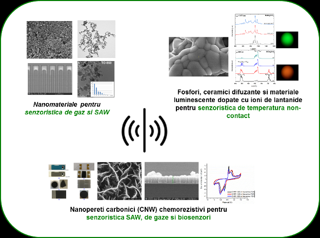 În cadrul prezentei etape s-a realizat sinteza și caracterizarea unor materiale utilizate în senzoristică și detectie prin metode cu laseri, plasmă și radiații. S-au obținut și caracterizat nanopulberi oxidice cu conținut scăzut de carbon prin tehnica pirolizei laser, fosfori (SrLaGaO4, Ca3Ta2Ga3O12), ceramici difuzante și materiale luminescente dopate cu ioni de lantanide (Nd3+, Er3+, Ho3+, Yb3+), nanopereți carbonici (CNW) simpli sau funcționalizați prin tehnici cu plasmă și nanoparticule cu sau fără proprietăți magnetice (nAg, nNi) prin iradiere cu electroni accelerați de mare energie.