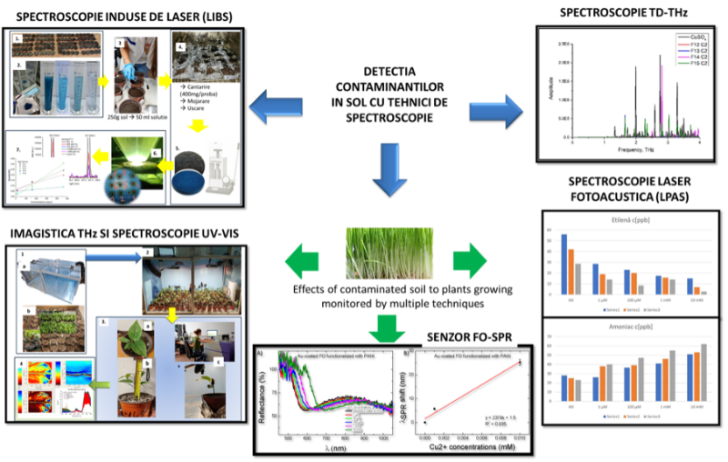 Astfel, au fost investigate efectele solului contaminat asupra plantelor crescute în acest mediu. Pentru a identifica concentrațiile de cupru în probele de sol, au fost utilizate tehnici de spectroscopie, Laser Breakdown Induced Spectroscopy și Time Domain Spectroscopy în domeniul THz, dezvoltând două protocoale de detecție a contaminanților în sol. A fost dezvoltată şi utilizată o cameră de creștere cu parametri de mediu controlați pentru studiul a 125 de plante de Asimina Triloba cultivate în probele de sol contaminat. Condițiile de iluminare, temperatură și umiditate a solului au fost menţinute constante fiind monitorizate efectele cuprului asupra acestor plante cu ajutorul spectroscopiei UV-VIS și imagisticii THz. În acest sens a fost dezvoltat un protocol specific pentru monitorizarea efectelor induse de probele de sol contaminat asupra plantelor folosind aceste două tehnici complementare.