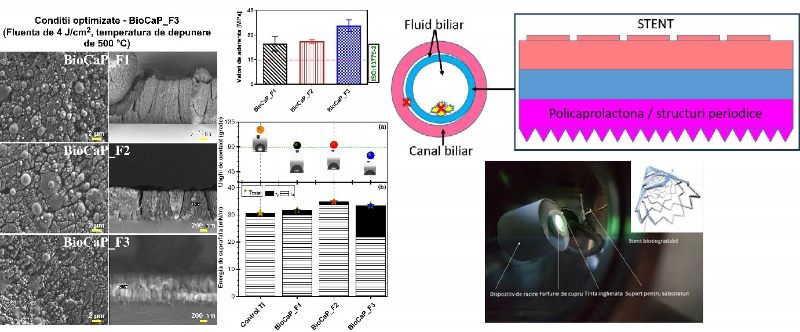 In prezent, exista o cerere semnificativa pentru productia de dispozitive medicale destinate aplicatiilor in medicina regenerativa, ceea ce se aliniaza cu avansul medicinei personalizate. In acest context, tehnologia din spatele stenturilor biliare devine un element crucial care contribuie la realizarea cu succes a procedurilor de transplant hepatic si faciliteaza recuperarea rapida a pacientului. In acest context, raportam fabricarea unui nou design de dispozitiv stent biliar bazat pe policaprolactona (PCL), complet resorbabil, destinat in primul rand sustinerii functiilor ductului biliar in perioada post-transplant hepatic. Prezentam rezultatele unui studiu care investigheaza efectele timpului si vitezei de centrifugare asupra caracteristicilor morfologice ale filmelor subtiri de PCL produse prin tehnica de acoperire prin centrifugare. In cele din urma, membranele de PCL au fost structurate prin iradierea cu radiatie laser polarizata liniar.