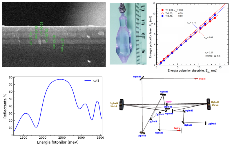 Principalul obiectiv al acestei faze a fost studiul unor configurații optice pentru subansamble și componente optice și electronice ale unui amplificator laser cu pulsuri sub-picosecunde, precum și realizarea de elemente ale laserului de pompaj (mediu activ laser, oglinzi laser) ce vor intra în configurația sistemului laserului final. Au fost realizate pentru prima dată prin metoda Czochralski și au fost caracterizate cristale laser de tip Nd:LaxGdyYzSc4-x-y-z(BO3)4 cu topire incongruentă și emisie laser eficientă la 1.06 µm. Au fost proiectate configurații de structuri dielectrice Bragg pentru realizarea de oglinzi laser, au fost obținute și caracterizare filme subțiri din SiO2, TiO2 și HfO2 depuse prin tehnicile PLD, TVA și magnetron sputtering și au fost determinați parametrii optici ai filmelor depuse. Au fost elaborate o serie de studii numerice bazate pe metoda diferențelor finite (FDTD) pentru a determina mediile optime de propagare a fasciculului laser care sa inducă o alungire temporală a pulsului laser in domeniul 0.5 – 1 ps. De asemenea, au fost dezvoltate o serie de modele raytracing pentru proiectarea unei scheme optime a unui amplificator laser in vederea obținerii unei eficiente maxime de amplificare conform cerințelor actuale în domeniul experimentelor cu laseri cu pulsuri ultra-scurte. Acest obiectiv reprezintă o etapă intermediară din realizarea unei surse laser pentru fabricație avansată aditivă și substractivă de dispozitive pentru tehnologii emergente.