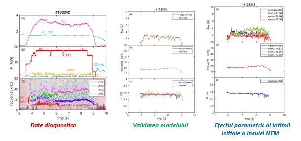 Scopul acestei întreprinderi este de a determina modul în care mărimea inițială a lățimii insulei magnetice asociată perturbațiilor neoclasice de forfecare (NTM) în plasmă influențează calculul amplitudinii și frecvenței de oscilație a perturbațiilor NTM. Modelul teoretic folosit e necesar să fie în prealabil testat astfel încât plierea pe datele experimentale a amplitudinii, frecvenței și, mai ales, locației perturbațiilor să fie optimă. Din acest motiv, localizarea teoretică a perturbațiilor constituie un preambul pentru validarea modelului folosit. O nouă metodă de localizare a perturbațiilor pe baza cunoașterii amplitudinii acestora este prezentată în acest studiu. Bazându-ne pe testarea cu succes a modelului de perturbații (Miron I.G. și JET Contributors 2021, Nucl. Fusion 61, 106016) față de rezultatele experimentale la JET, implementarea sa inversată este aplicată pentru a determina locația modurilor. Amplitudinea experimentală a modului joacă, de această dată, rolul datelor de intrare cu scopul de a obține, invers, locația perturbațiilor. Precizia locației calculate este condiționată de o bună regăsire teoretică a amplitudinii și frecvenței experimentale a modului perturbat. Pe baza condițiilor inițiale alese, locația dorită este cea asociată celei mai bune potriviri posibile. Fiabilitatea modelului nostru asigură practic derivarea locației potrivite. Nu sunt utilizate profiluri de date privind factorul de siguranță și viteza de rotație a plasmei. Metoda a fost testată și verificată pe larg pentru a deveni o alternativă validă la tehnicile obișnuite de localizare.