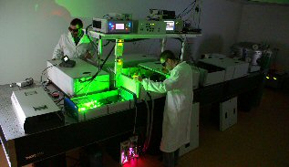 | CPA – laser system Experiments with a femtosecond laser at microJules energy level and 2KHz repetition rate are done with a CPA system (Clark-MRX 2101). The amplified output beam is at 775 nm wavelength, with 200 fs pulse duration and the max. pulse energy is 0.7 mJ. This system is used in experiments such as laser ablation for micro and nano-structuring experiment on ceramics, semiconductors and metallic film, or two-photon photo-polymerization of photoresists for 3D micro-structuring, development of a multipulses laser for pump-probe experiments. An additional output from the oscillator of the CPA offers femtosecond laser beam at 35 MHz for ultrafast laser spectroscopy.CPA femtosecond laser ![]() | |