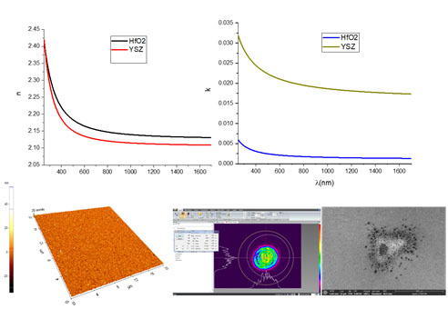 Abstract: În cadrul acestei faze au fost obţinute straturi subţiri şi heterostructuri de materiale dielectrice care au fost investigate din punct de vedere morfologic, optic şi dielectric. Din punct de vedere morfologic au fost constatate diferenţe notabile între diversele tipuri de straturi subţiri dielectrice, cu variaţia valorii RMS de la 0.7 nm până la 17 nm. Din punct de vedere al indicelui de refracţie se obţin valori comparabile cu literatura de specialitate pentru toate cele trei materiale dielectrice, iar din punct de vedere al coeficientului de extincţie în cazul filmului de TiO2 acesta este mare în regiunea de lungimi de undă mici (valori perfect normale deoarece TiO2 atât în structura rutile cât şi în structura anatase prezintă o valoare a benzii interzise de 3.23 eV). În ceea ce priveşte filmele de YSZ şi HfO2, absorbţia optică (coeficientul de extincţie) este mică pe tot intervalul măsurat, cu o uşoară creştere la lungimi de undă din zona ultraviolet. Heterostructurile de HfO2/YSZ au prezentat un comportament dielectric superior straturilor individuale, dispersia în frecvenţă a constantei dielectrice şi a pierderilor dielectrice apărute cu creşterea frecvenţei câmpului electric aplicat sugerează existenţa unor defecte structurale intrinseci care conduc la creşterea curenţilor de scurgere. Acelaşi comportament a fost observat şi în cazul straturilor subţiri dielectrice individuale. Testele efectuate pentru determinarea pragului de ablaţie laser au arătat valori mai ridicate ale pragului de distrugere în cazul testelor făcute cu durate de puls de ordinul ns datorate unei intensităţi de energie mai mici aplicate la nivelul filmelor subţiri, în comparaţie cu pulsurile de fs. Cea mai ridicată valoare a pragului de distrugere a fost obţinută pentru heterostructura de oxid de hafniu depusă pe oxid de zirconiu stabilizat cu ytriu, pentru care s-au obţinut valori de 0.82 J/cm2.