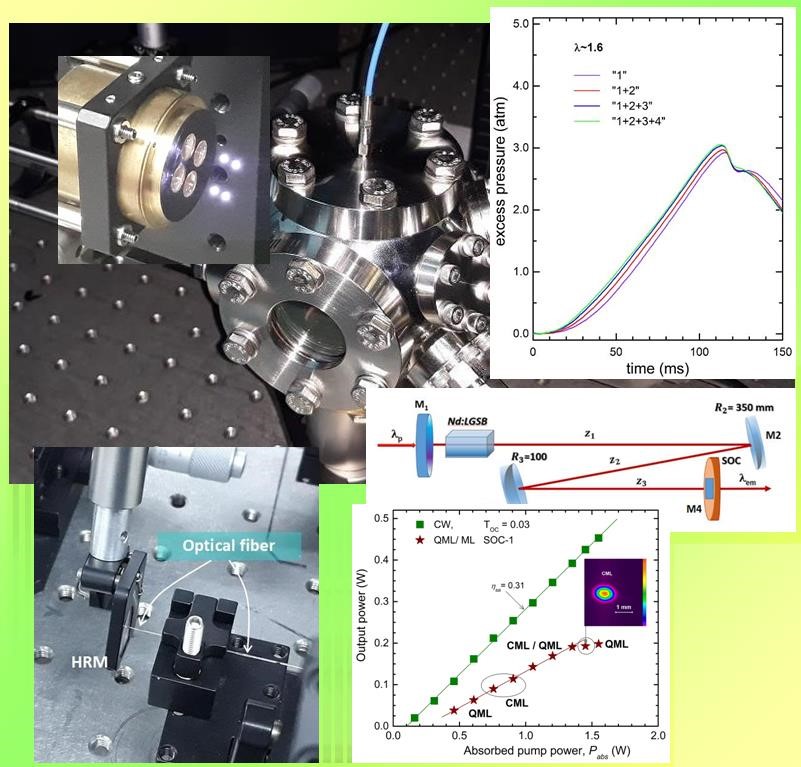 Abstract: În această fază de contract sunt raportate rezultate ale unor experimente de aprindere cu laser a amestecului combustibil aer-CH4 (metan), cu concentrație stoichiometrica (λ∼1), sărăcit în CH4 (λ∼1.1 până la 1.6) dar şi cu concentrație ridicată de CH4 (λ∼0.9). Aprinderea s-a făcut într-o cameră statică cu volumul de 0.2 dm3, presiunea inițială de încărcare a camerei fiind de 1 bar. Aprinderea s-a făcut cu un dispozitiv tip bujie laser, într-un singur punct, dar şi cu un laser cu patru fascicule, acestea fiind focalizate în patru poziții diferite. Pentru fiecare experiment au fost înregistrate curbele de presiune. S-au determinat limitele amestecului aer-CH4 pentru care aprinderea cu laser a putut fi realizată. Al doilea set de experimente se referă la operarea laser în regim de ‘quasi-mode-locking’ (QML) şi ‘continuous mode-locking’ (CML) a unui mediu activ Nd:LGSB (4.6-at.% Nd, grosime de 3 mm), pompat cu dioda laser la 807 nm. Pulsurile laser în regim CML au avut durata de 1.43 ps şi energia de 1.63 nJ la o rată de repetiție de 118 MHz; puterea medie a fost de 0.19 W. Al treilea set de rezultate descrie emisia laser obținută de la o fibră optică dopată cu Yb, YDCF-Yb-30/250P-FAC (CorActive High-Tech, Inc., Canada) cu partea centrală activă având diametrul de 30 μm şi manta sub formă de octoedru regulat cu diametrul de 250 μm. Au fost determinate performantele emisiei laser în regim de pompaj quasi-continuu, la diferite lungimi ale fibrei. O fibră cu lungimea de 1.2 m a emis pulsuri laser cu energia Ep= 7.85 mJ pentru o energie absorbită a pulsului de pompaj Eabs= 14.4 mJ (adică cu o eficiență optică, în funcție de Eabs, de ηoa∼0.54); panta emisiei laser, în funcție de Eabs, a fost ηsa∼0.63.