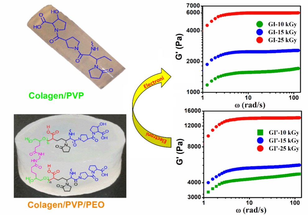 Abstract: În această etapă a proiectului, au fost obținute hidrogeluri superabsorbante din polimeri biodegradabili pe bază de colagen, PVP și PEO, care pot fi utilizate ca pansamente pentru vindecarea țesuturilor moi lezate. Amestecul de polimeri a fost reticulat cu fascicule de electroni, în atmosferă inertă de argon. Hidrogelurile obținute au fost caracterizate din punct de vedere fizico-chimic prin: analiza sol-gel, randamentele radiochimice de reticulare și de degradare, determinarea gradului de gonflare și stabilitate în medii fiziologice simulate, cinetică de gonflare în apă deionizată, analiză reologică și determinarea parametrilor de structură specifici unui hidrogel (masa moleculară dintre două puncte de reticulare, MC; dimensiunea ochiului rețelei de hidrogel, ξ; densitate de reticulare, Ve). Compoziția hidrogelurilor superabsorbante a fost investigată prin spectroscopie FT-IR. Hidrogelurile de colagen/PVP/PEO au prezentat o fracție de gel mai mare și care a depins de doza de iradiere aplicată. Rezultatele obținute au evidențiat că pentru hidrogelul de colagen/PVP, gradul de gonflare la 25 kGy, are valoarea de 4000% și scade de aproximativ 2,5 ori, când în compoziția hidrogelului este adăugat și PEO. Proprietățile pe care le prezintă hidrogelurile obținute din colagen, PVP și PEO, confirmă că acestea pot fi utilizate pentru diferite tipuri de aplicații, cum sunt: pansamente sau sisteme de eliberare controlată a diferitelor produse medicamentoase sau ca matrici polimerice în ingineria tisulară a țesuturilor moi. Proprietățile globale ale acestor hidrogeluri pot fi ajustate prin varierea parametrilor de iradiere și a compoziției polimerice, astfel încât să se obțină un produs final cu proprietăți controlate și în același timp cu calitate bună pentru scopul urmărit.