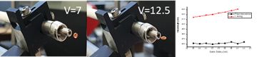 d) Filamentul de plasmă generat în jetul de gaz la 2 mm față de duză.
