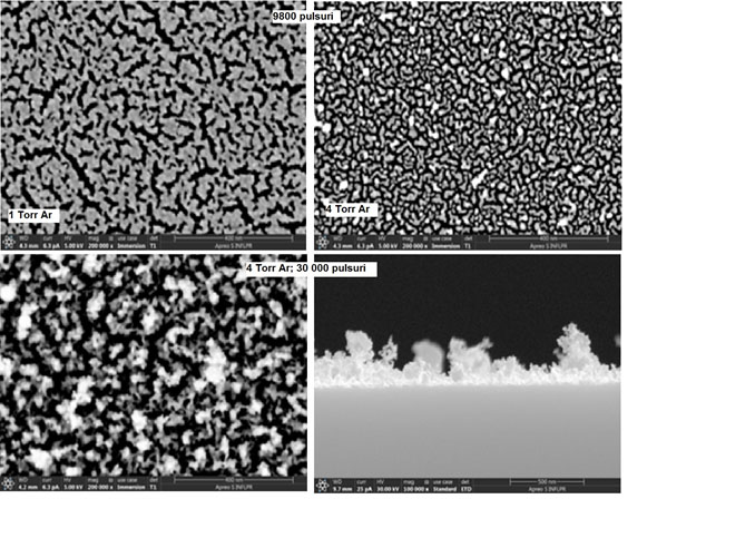 Rugozitatea straturilor s-a determinat cu ajutorul microscopiei AFM. Un strat dens şi uniform de Au depus în vid are rugozitatea 0.7 nm. Straturi poroase depuse în 4 Torr Ar au rugozitatea de 6 nm (9800 pulsuri ablaţie), respectiv 30 nm (30000 pulsuri de ablaţie).