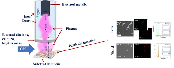 Obţinerea particulelor s-a făcut utilizând jetul de plasmă de radiofrecvenţă (RF), la presiune atmosferică. Precursorii metalici utilizaţi au fost precursori solizi. Studiul a completat gama de materiale utilizate, astfel particule de nichel, fier şi crom au fost produse. Particulele au fost caracterizate prin SEM şi EDX. Investigaţii de spectroscopie optică de emisie au fost realizate pentru caracterizarea plasmei, iar măsurarea temperaturilor de proces s-a făcut folosind un dispozitiv special creat pentru acest scop. Se concluzionează că puterea de RF este un parametru esenţial ce determină caracteristicile particulelor (mărime, formă) şi că temperatura măsurată la electrodul legat la masă/substrat creşte împreună cu creşterea puterii aplicate. Totuşi, creşterea temperaturii nu are un caracter liniar pe tot intervalul de putere de RF aplicat.