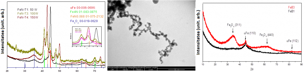 Abstract: Au fost sintetizate prin piroliză laser și analizate diferite nanoparticule pe bază de fier: 1) Nanopulberi de Fe dopate cu N, folosind laserul cu CO2 având λ=10.74 µm; 2) Nanopulberi de Fe dopate cu B folosind laserul cu CO2 având λ=10.59 µm; 3) Nanopulberi de oxid de Fe sintetizate folosind vapori de etanol ca senzitivant pentru laser CO2 (O18) λ=9.245 µm. Folosind lungimea de emisie pe linia 10P34- amoniacul a fost utilizat ca agent senzitivant optim, obţinând pulberi preponderent cu structură cristalină de Fe metalic, Fe4N sau FeN0.088, acestea prezintă un conținut neobișnuit de ridicat de fier (50-75 at.%) şi un conținut scăzut de oxigen (23-37 at/%), astfel că o parte importantă din legăturile Fe se prezintă ca fier zerovalent, restul fiind în stările obișnuite de ionizare Fe2+ şi Fe3+. Procesul de piroliză laser implicând amestecul reactiv format din Fe(CO)5 şi B2H6 a condus la formarea de NPs cu o slabă cristalinitate, funcție de cantitatea de B înglobată, particulele prezervă sau nu, Fe zerovalent. Folosind vapori de etanol ca senzitivant pentru laser CO2 având λ=9.245 µm analizele EDX relevă următoarea compoziţie elementală: 2.1 at% C, 35.5 at% Fe si 62.4 at.% O, astfel că raportul Fe/O este foarte apropiat de 2/3 specific γFe2O3.