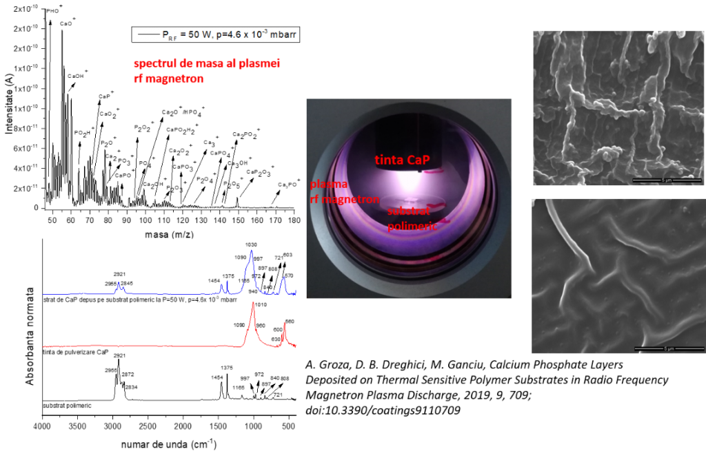 Structura elementală şi moleculară a depunerilor obţinute pe suporţii polimerici determinată prin spectroscopie de dispersie a electronilor şi spectroscopie de infraroşu cu transformata Fourier a indicat formarea unei structuri amorfe de CaP. Analizele morfologice ale straturilor subţiri obţinute realizate prin microscopie electronică de baleiaj şi microscopie de forţă atomică au arătat o modelare termică a substratului datorită încălzirii acestuia pe durata procesului de depunere. Straturile de CaP prezintă o structură granulară dependentă de presiunea de lucru.