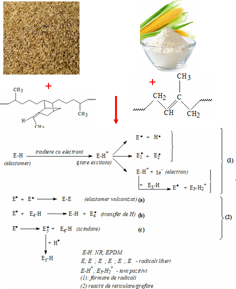 Dezvoltarea unor metode de vulcanizare/croos-linking prin iradiere a constat în obţinerea de materiale compozite pe bază de elastomer EPDM/rumegus. Dozele de iradiere au fost cuprinse între 75-600 kGy, iar concentraţia de filler (rumegus) a variat între 5 şi 50 phr. Pentru toate materialele procesate prin iradiere au fost realizate determinări mecanice, fizico-chimice şi structurale. Rezultatele mecanice obţinute demonstrează efectul pozitiv al rumeguşului asupra elastomerului. Variaţia acestor proprietăţi cu creşterea dozei de iradiere este datorată apariţiei reticulării între lanţurile elastomerice şi a grefării materialului de umplutură pe lanţurile polimerice. De asemenea, valori scăzute ale raportului p0/q0 (valorile obţinute fiind: 0.1148, 0.0889, 0.0812, 0.1204 pentru 5, 10, 15 şi 20 phr rumeguş în amestec) sunt asociate cu o interacţie radical-radical îmbunătăţită în polimerul compozit.