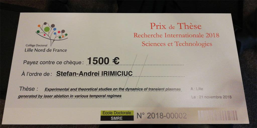 În data de 21 Noiembrie 2018 Universitatea din Lille, Franța a acordat Prix de these „Recherche Internationale” în cadrul conferinței STARTDOC 2018 – Rentrée des Écoles Doctorales Lille Nord de France, tezei de doctorat elaborată de Ștefan Andrei Irimiciuc. Premiul a fost înmânat de Jean-Louis Debré, fost ministriu de Interne și fost Președinte al Curții Constituționale. Prin acordarea acestui premiu, teza a fost recunoscută ca fiind cea mai bună lucrare de doctorat din domeniul Științe Exacte și Tehnologii din consorțiul școlilor doctorale din nordul Franței.